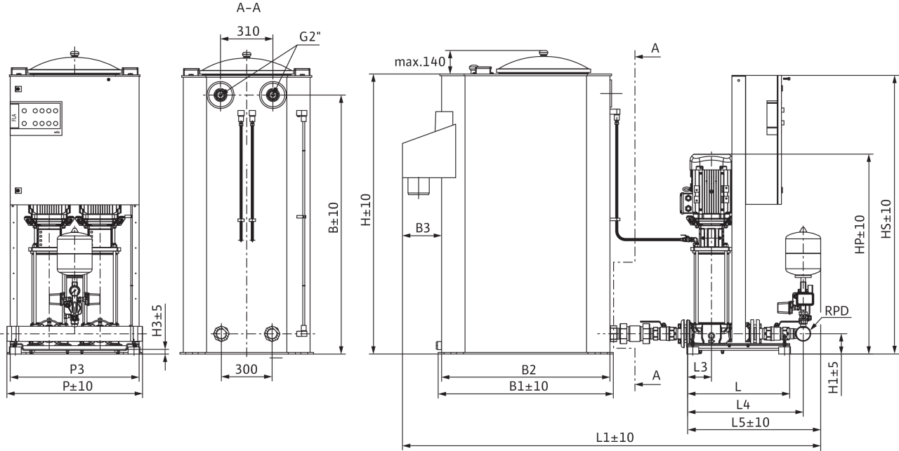 Приемный резервуар (540 л) с разрешением к применению в питьевом водоснабжении. Нормальновсасывающий вертикальный многоступенчатый высоконапорный центробежный насос из нержавеющей стали с трехфазным электродвигателем. Уплотнение вала посредством стандартного скользящего торцового уплотнения кассетного типа (насосы Helix). Мембранный напорный бак (объем 8 л), интегрированный обратный клапан, запорная арматура с всасывающей и напорной стороны (заблокирована от случайного включения), манометрический выключатель и манометр для автоматического управления установкой. В серийном исполнении с защитой насоса посредством отбора минимальных объемов через байпас, без вспомогательной энергии