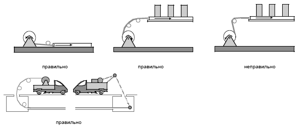 Не снимайте планки и торцевые заглушки кабеля до его укладки. В случае отрезания куска кабеля от остальной бухты надевайте торцевые заглушки обратно на кабель. Разматывание и перематывание кабелей осуществляются, как показано на рисунках. В случае перемотки кабеля с одного барабана на другой следует учитывать минимальный радиус сгибания кабеля и, следовательно, диаметр цилиндрического барабана.