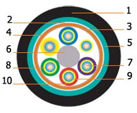 | | 1 - Внешняя оболочка 2 - Гидроизолирующая лента 3 - Внутренняя оболочка 4 - Соединяющая лента 5 - Гофрированная стальная броня 6 - Центральный силовой элемент 7 - Оптическое волокно 8 - Упрочняющие нити 9 - Буфер 10 - Оболочка миникабеля |