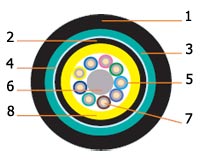 | | 1 - Внешняя оболочка 2 - Внутренняя оболочка 3 - Гофрированная стальная броня 4 - Гидроизолирующая лента 5 - Буфер 6 - Центральный силовой элемент 7 - Оптическое волокно 8 - Упрочняющие нити |