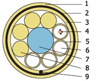 | | 1 - Внешняя оболочка из полиэтилена 2 - Гофрированная стальная броня 3 - Гидрофобный материал 4 - Оптическое волокно 5 - Свободная трубка 6 - Заполнитель трубки 7 - Центральный силовой элемент 8 - Кордель 9 - Рип-корд |