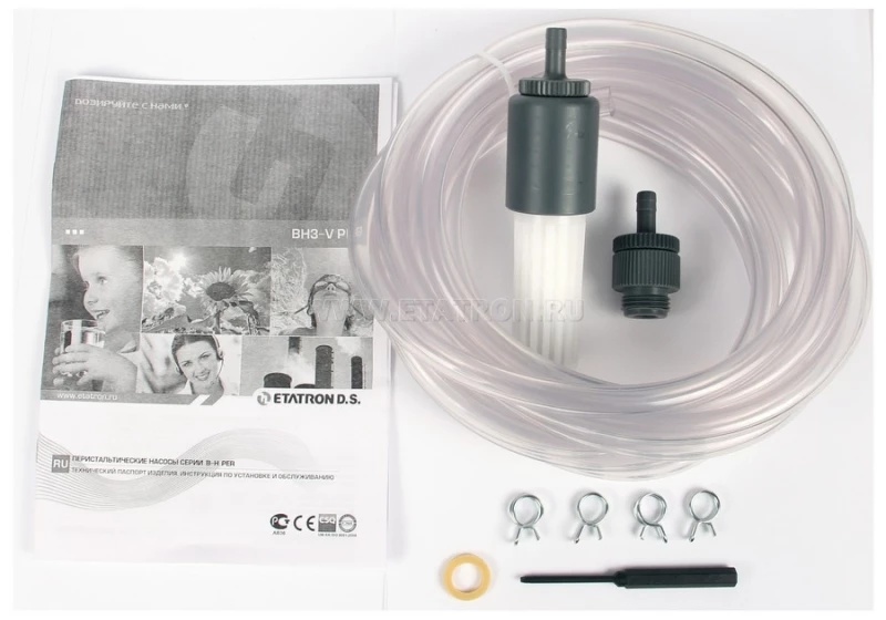 1 шт. – перистальтический дозирующий насос. 4 м.п. – шланг забора/сброса из гибкого ПВХ (8x12). 1 шт. – клапан забора реагента. 1 шт. – клапан впрыска реагента. 1 шт. – паспорт/инструкция по эксплуатации