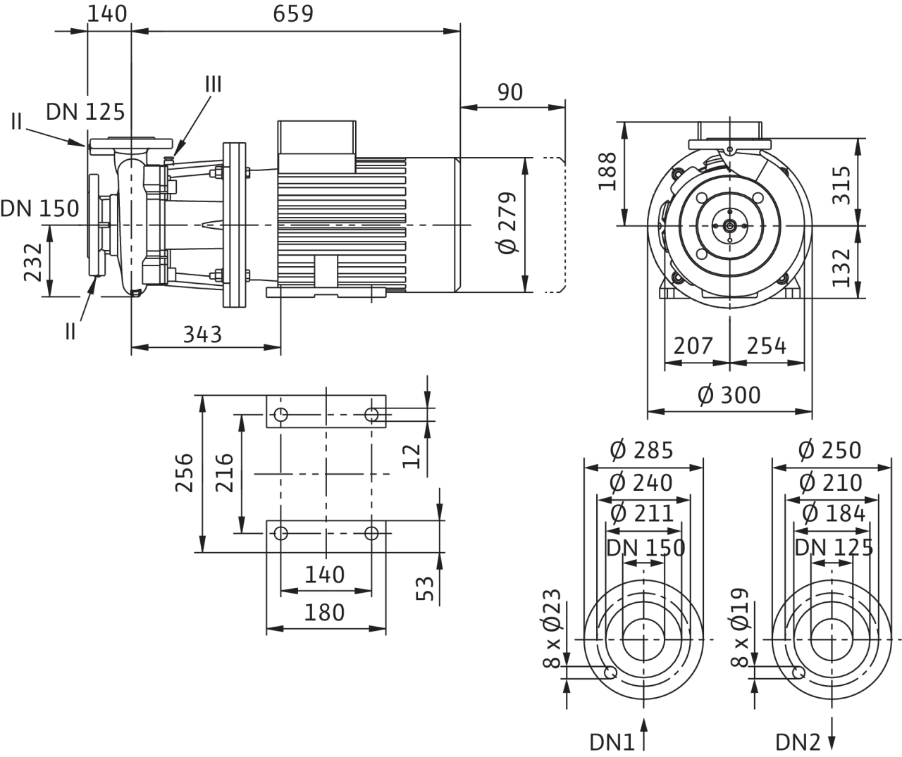 | Номинальный внутренний диаметр фланца (с напорной стороны) | DN 125 |
