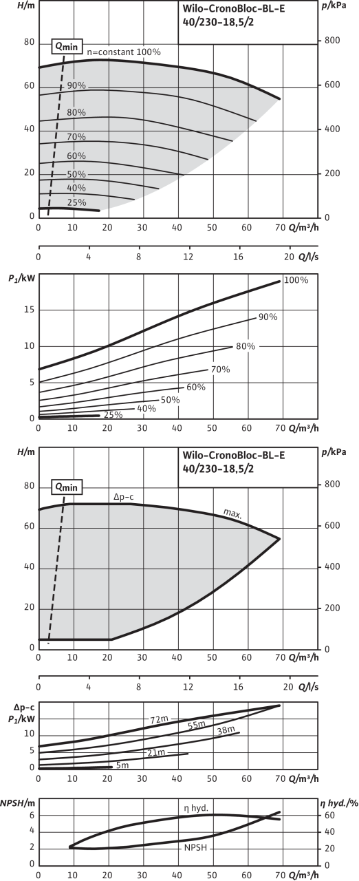 Одноступенчатый центробежный насос с сухим ротором блочного типа для установки на фундаменте со встроенным частотным преобразователем для электронного регулирования в т. ч. постоянного перепада давления (Δp-c). Насос можно эксплуатировать в режиме работы Δp-c только с внешним дифференциальным датчиком давления (комплект дифференциального датчика давления); его подключение не выполняется на корпусе насоса. Устройство CronoBloc-BL-E предназначено для перекачивания воды систем отопления (согласно VDI 2035), холодной воды и водогликолевых смесей без абразивных веществ в системах отопления, кондиционирования и охлаждения.