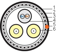 | 1 - Внешняя оболочка 2 - Гофрированная стальная броня 3 - Защитная пленка 4 - Медный кабель 5 - Рип-корд 6 - Волоконно-оптический кабель |