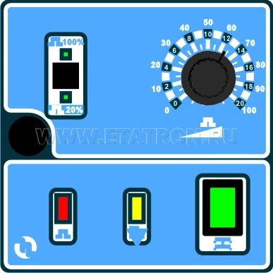 4 светодиода: режим работы 0-20%, режим работы 0-100%, частота импульсов, сигнализация датчика уровня; кнопка-индикатор вкл/выкл. Электропитания