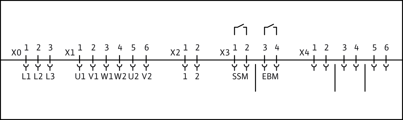 x0: подключение к сети x1: электропитание, насосы x2: подключение WSK x3: беспотенциальные контакты (сигнализация); 1–2 – SSM (обобщенная сигнализация неисправности); 3–4 – EBM (раздельная сигнализация рабочего состояния) x4: разъемы для датчиков: 1–2 – TLS (защита от сухого хода); 3 – датчик (+); 4, датчик (In); 5–6 – внешнее включение/выключение