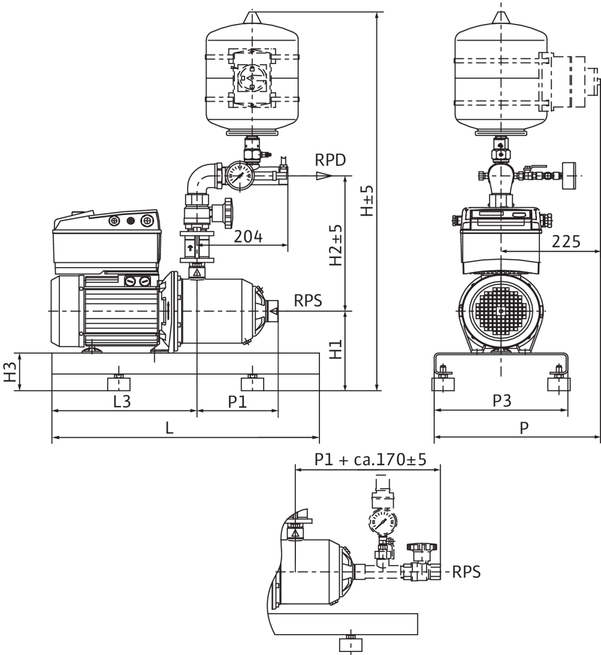 Установлена на оцинкованной фундаментной раме с регулируемой по высоте вибропоглощающей опорой; мембранный напорный бак (емкостью 8 л) с проточным оборудованием, соответствующим стандарту DIN 4807, встроенным обратным клапаном, датчиком давления (4–20 мА) и манометром для автоматического регулирования установки с функцией p = постоянное.