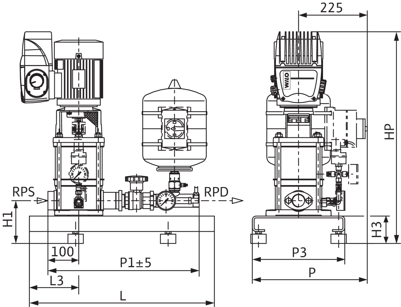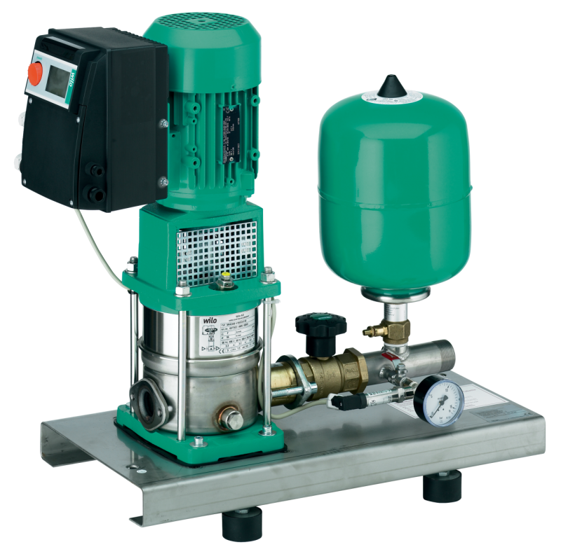 Установка для водоснабжения в качестве компактной установки для повышения давления или в качестве средства водоснабжения для подключения к приемному резервуару/водопроводной сети. Состоит из: нормальновсасывающего вертикального многоступенчатого высоконапорного центробежного насоса из нержавеющей стали с электродвигателем стандарта IE2. Манжетное уплотнение посредством не зависящего от направления вращения скользящего торцового уплотнения. Электродвигатель со встроенным частотным преобразователем с воздушным охлаждением и плавной регулировкой частоты вращения от 24 Гц до макс. 60 Гц. Установлена на оцинкованной фундаментной раме с регулируемой по высоте вибропоглощающей опорой; мембранный напорный бак (емкостью 8 л) с проточным оборудованием, соответствующим стандарту DIN 4807, встроенным обратным клапаном, датчиком давления (4–20 мА) и манометром для автоматического регулирования установки с функцией p = постоянное. Бесступенчатая установка заданного значения напора одной кнопкой на частотном преобразователе. Автоматическое определение нулевой подачи и отключение насоса. Встроенное реле электродвигателя с электронным контролем тока.