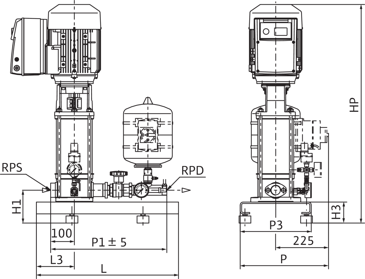 Установка для водоснабжения в качестве компактной установки для повышения давления или в качестве средства водоснабжения для подключения к приемному резервуару/водопроводной сети. Состоит из: нормальновсасывающего вертикального многоступенчатого высоконапорного центробежного насоса из нержавеющей стали с электродвигателем стандарта IE2. Манжетное уплотнение посредством не зависящего от направления вращения скользящего торцового уплотнения. Электродвигатель со встроенным частотным преобразователем с воздушным охлаждением и плавной регулировкой частоты вращения от 24 Гц до макс. 60 Гц. Установлена на оцинкованной фундаментной раме с регулируемой по высоте вибропоглощающей опорой; мембранный напорный бак (емкостью 8 л) с проточным оборудованием, соответствующим стандарту DIN 4807, встроенным обратным клапаном, датчиком давления (4–20 мА) и манометром для автоматического регулирования установки с функцией p = постоянное. Бесступенчатая установка заданного значения напора одной кнопкой на частотном преобразователе. Автоматическое определение нулевой подачи и отключение насоса. Встроенное реле электродвигателя с электронным контролем тока.