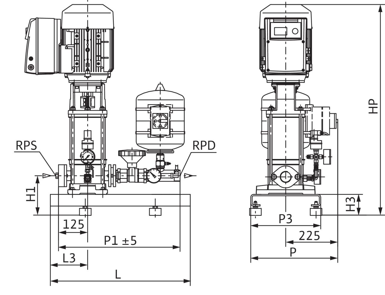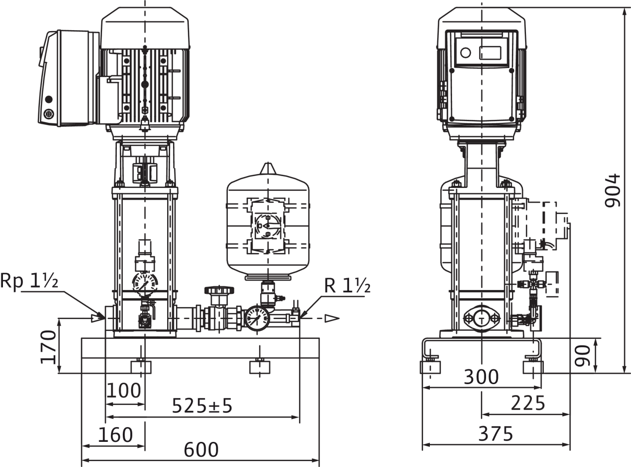 Установка для водоснабжения в качестве компактной установки для повышения давления или в качестве средства водоснабжения для подключения к приемному резервуару/водопроводной сети. Состоит из: нормальновсасывающего вертикального многоступенчатого высоконапорного центробежного насоса из нержавеющей стали с электродвигателем стандарта IE2. Манжетное уплотнение посредством не зависящего от направления вращения скользящего торцового уплотнения. Электродвигатель со встроенным частотным преобразователем с воздушным охлаждением и плавной регулировкой частоты вращения от 24 Гц до макс. 60 Гц. Установлена на оцинкованной фундаментной раме с регулируемой по высоте вибропоглощающей опорой; мембранный напорный бак (емкостью 8 л) с проточным оборудованием, соответствующим стандарту DIN 4807, встроенным обратным клапаном, датчиком давления (4–20 мА) и манометром для автоматического регулирования установки с функцией p = постоянное. Бесступенчатая установка заданного значения напора одной кнопкой на частотном преобразователе. Автоматическое определение нулевой подачи и отключение насоса. Встроенное реле электродвигателя с электронным контролем тока.