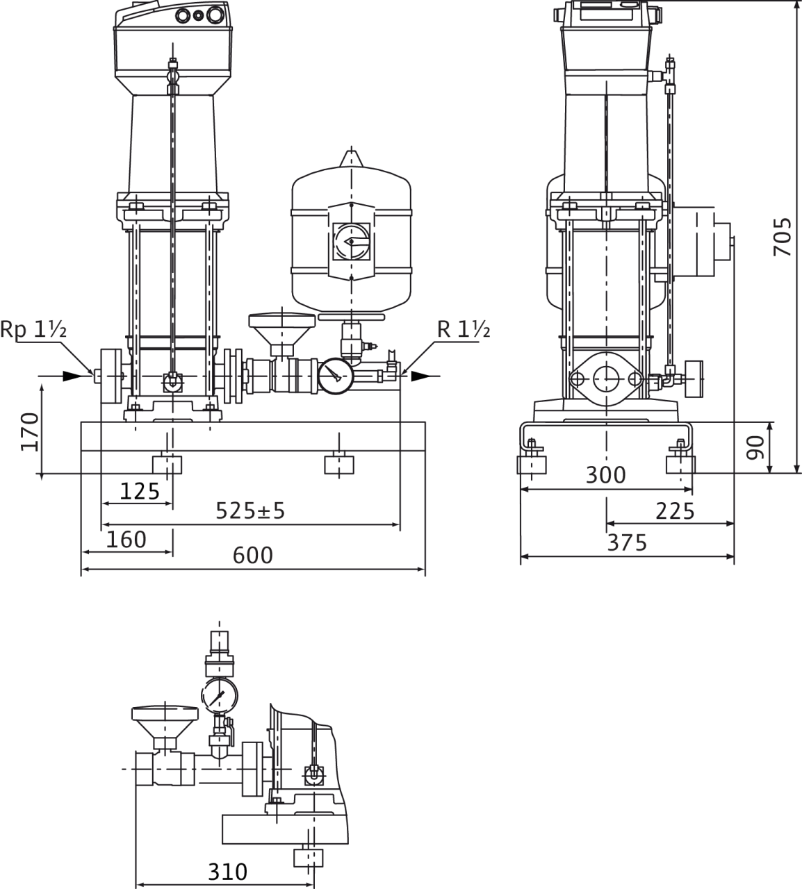 Установлена на оцинкованной фундаментной раме с регулируемой по высоте вибропоглощающей опорой; мембранный напорный бак (емкостью 8 л) с проточным оборудованием, соответствующим стандарту DIN 4807, встроенным обратным клапаном, датчиком давления (4–20 мА) и манометром для автоматического регулирования установки с функцией p = постоянное. Бесступенчатая установка заданного значения напора одной кнопкой на частотном преобразователе. Автоматическое определение нулевой подачи и отключение насоса. Встроенное реле электродвигателя с электронным контролем тока.