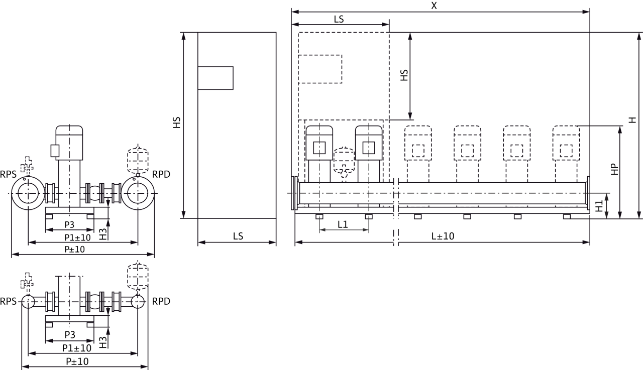 - Автоматическое, зависимое от нагрузки подключение от 1 до n насос(ов) пиковой нагрузки в зависимости от регулируемых величин давления: постоянное, p-c