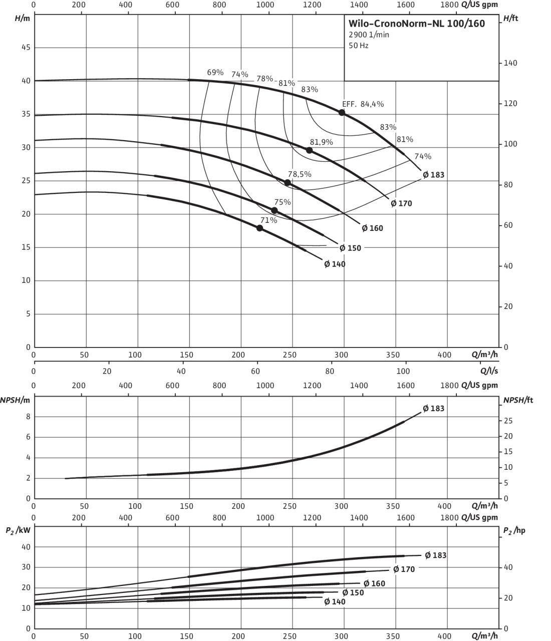 Электродвигатель IEC с 3 термодатчиками. Уплотнение вала посредством скользящего торцового уплотнения до температуры 120 В°C. Корпус из серого чугуна, вал из нержавеющей стали, рабочее колесо из серого чугуна (рабочее колесо из бронзы доступно за дополнительную плату). Электродвигатели с технологией IE3.