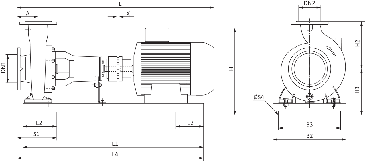 Одноступенчатый центробежный насос в качестве насоса на опорной раме согласно стандарту EN 733, с осевым всасывающим патрубком и радиальным напорным патрубком, для установки на фундаменте. Насос с опорой и прифланцованной опорой подшипника, упругой муфтой/съемной муфтой (за дополнительную плату), кожухом муфты и электродвигателем, установленными на общей опорной раме.
