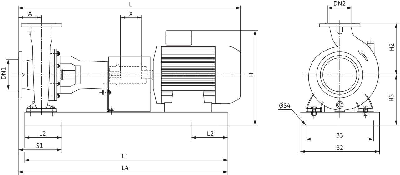 Одноступенчатый центробежный насос в качестве насоса на опорной раме согласно стандарту EN 733, с осевым всасывающим патрубком и радиальным напорным патрубком, для установки на фундаменте. Насос с опорой и прифланцованной опорой подшипника, упругой муфтой/съемной муфтой (за дополнительную плату), кожухом муфты и электродвигателем, установленными на общей опорной раме.