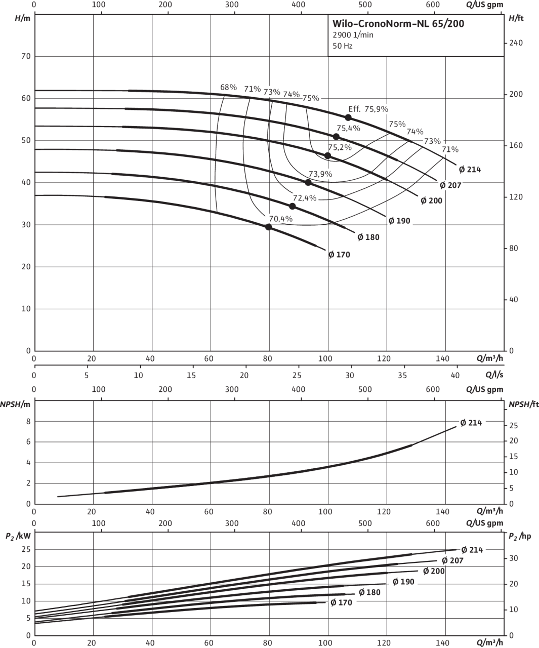 Электродвигатель IEC с 3 термодатчиками. Уплотнение вала посредством скользящего торцового уплотнения до температуры 120 В°C. Корпус из серого чугуна, вал из нержавеющей стали, рабочее колесо из серого чугуна (рабочее колесо из бронзы доступно за дополнительную плату). Электродвигатели с технологией IE3.