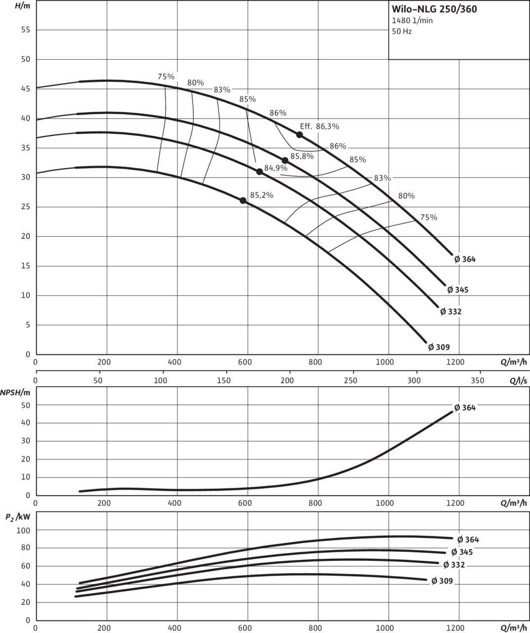 Электродвигатель IEC с 3 термодатчиками. Уплотнение вала посредством скользящего торцового уплотнения до температуры 120 В°C. Корпус из чугуна с шаровидным графитом, вал из нержавеющей стали, рабочее колесо из серого чугуна (рабочее колесо из бронзы доступно за дополнительную плату). Электродвигатели с технологией IE3.