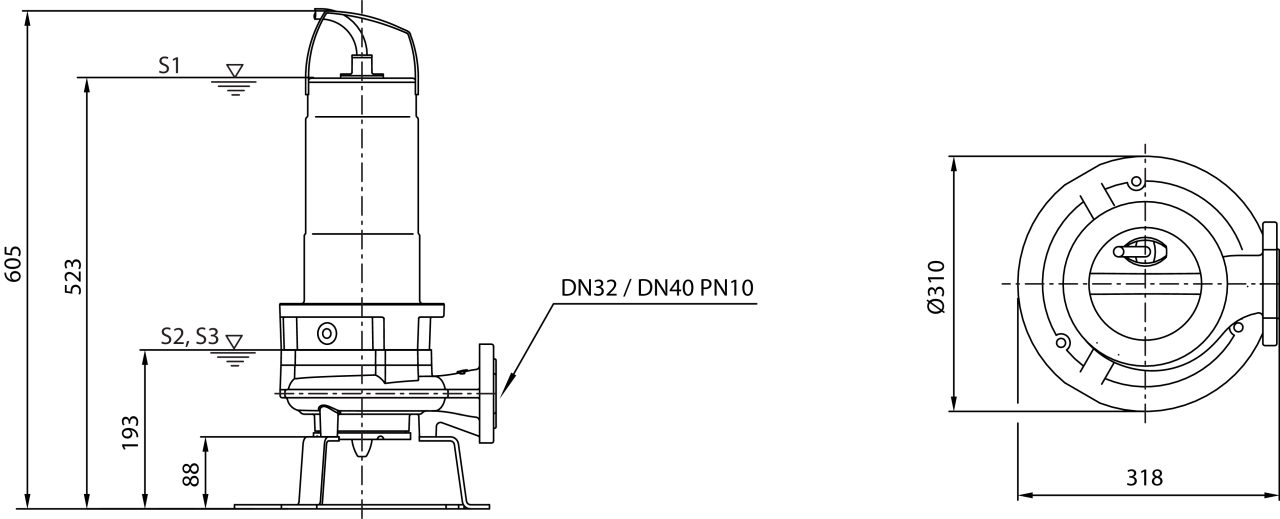 Полностью погружной дренажный насос для сточных вод с внутренним режущим механизмом для вертикальной установки в погруженном состоянии, для перекачивания коммунальных и промышленных сточных вод, содержащих фекалии, а также длинноволокнистые фракции. Корпус гидравлической части и рабочее колесо из серого чугуна, корпус электродвигателя из нержавеющей стали, уплотнение со стороны насоса и электродвигателя с двумя независимыми скользящими торцевыми уплотнениями. Напорный патрубок с горизонтальным патрубком напорного слива и резьбовым/фланцевым соединением. Электродвигатель насоса с сухим ротором в однофазном исполнении с защитой от перегрева и с камерой уплотнений. Соединительный кабель с конденсаторным переключателем и штекером с защитным контактом.