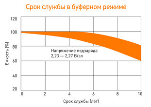 буферном режиме 8 лет, в циклическом - 280 циклов при 100% глубине разряда.