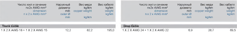 Trunk Cable: макс. 45 Q / km (шлейф); Drop Cable: макс. 184 Q / km (шлейф) |