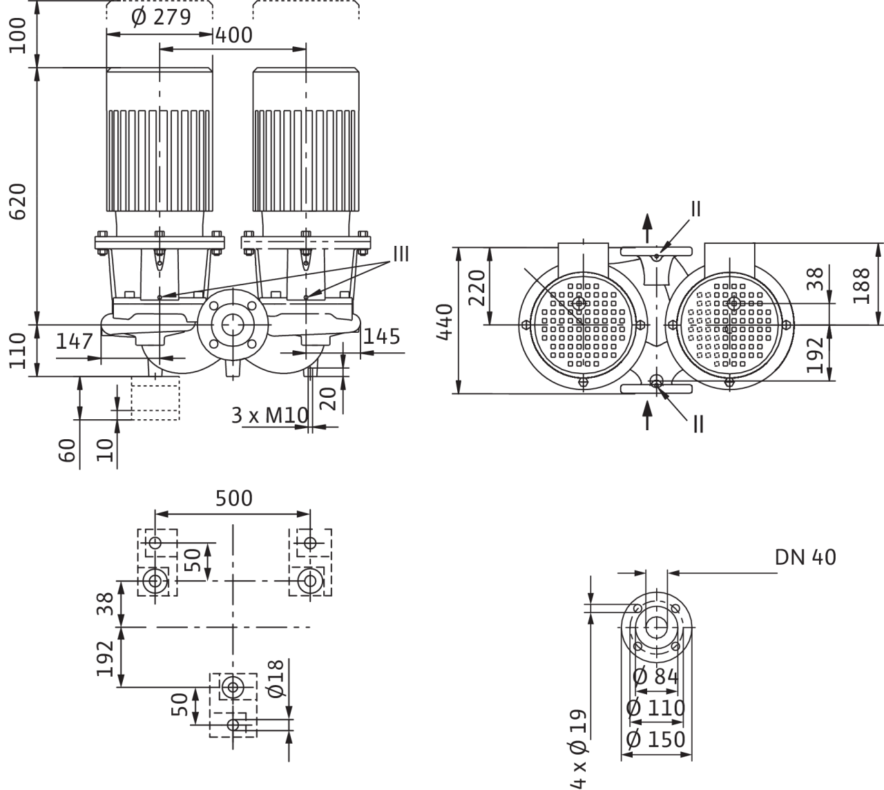 Технический паспорт Характеристики 2-полюсный – работа одного насоса Габаритный чертеж II отверстие для измерения давления R 1 / 8 ; III удаление воздуха R 1 / 8 Схема подключения Δ: Схема соединения – треугольник Y: Схема соединения...