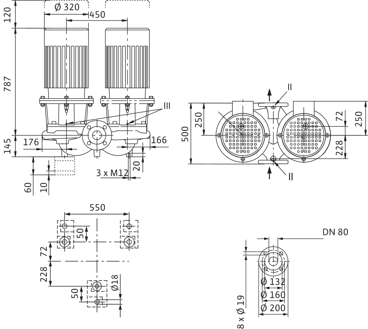Технический паспорт Характеристики 2-полюсный – работа одного насоса Габаритный чертеж II отверстие для измерения давления R 1 / 8 ; III удаление воздуха R 1 / 8 Схема подключения Δ: Схема соединения – треугольник Y: Схема соединения...