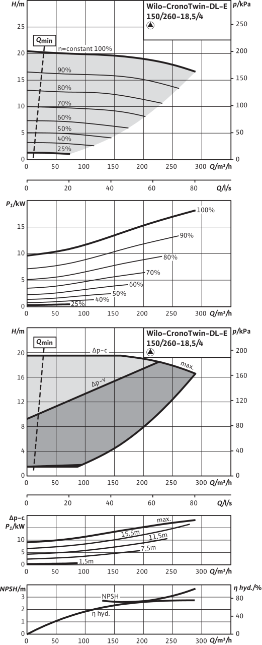 Технический паспорт Характеристики 4-полюсный, работа одного насоса Допустимая перекачиваемая среда (другие среды по запросу) Вода систем отопления (согласно VDI 2035) • Водогликолевая смесь (при доле гликоля 20-40 об. % и температуре перекачиваемой...