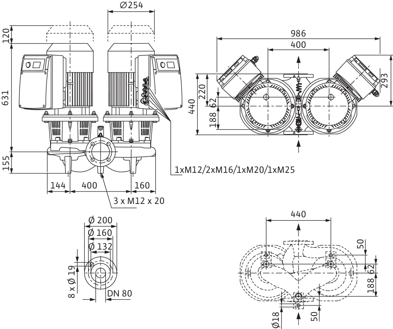 Сдвоенный насос с сухим ротором линейного типа для установки в трубах или на фундаменте со встроенным частотным преобразователем для электронного регулирования параметров, в том числе постоянного или переменного перепада давления (Δp-c/Δp-v).