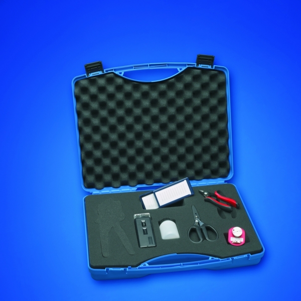 В чемодане находятся все обрабатывающие инструменты, необходимые для профессионального изготовления штекеров HCS 200/230 мкм «техникой склеивания» для штекеров ST. Основные элементы: обжимные клещи, 3 x инструмент для снятия изоляции волокна (0,6, 0,3, 0,18 мм), подрезатель волокна, нагревательная печь, ручной микроскоп (100-кратный), переменный адаптер ST, наждачная бумага зернистостью (0,3 мкм, 5 мкм), шлифовальная пластина, монтажный нож, шлифовальный диск, эпоксидный клей, шприц и алюминиевый чемоданчик.