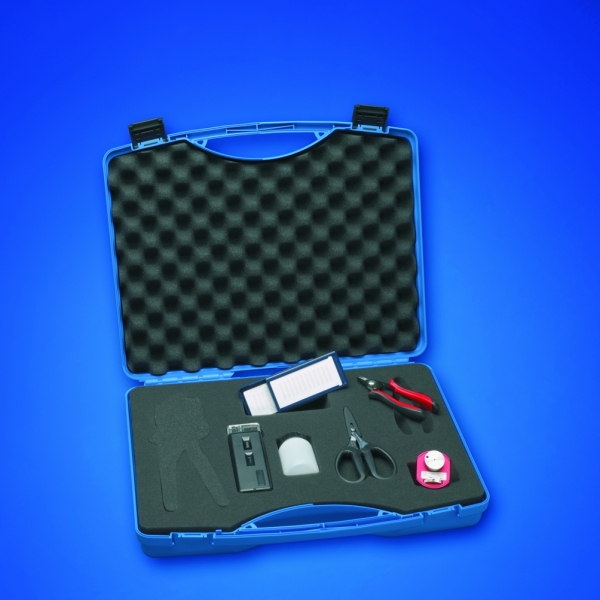 В чемодане находятся все обрабатывающие инструменты, необходимые для профессионального изготовления штекеров HCS 200/230 мкм «техникой склеивания» для штекеров F-SMA. Основные элементы: обжимные клещи, 3 x инструмент для снятия изоляции волокна (0,6, 0,3, 0,18 мм), подрезатель волокна, нагревательная печь, ручной микроскоп (100-кратный), переменный адаптер F-SMA, наждачная бумага зернистостью (0,3 мкм, 5 мкм), шлифовальная пластина, монтажный нож, шлифовальный диск, эпоксидный клей, шприц и алюминиевый чемоданчик.