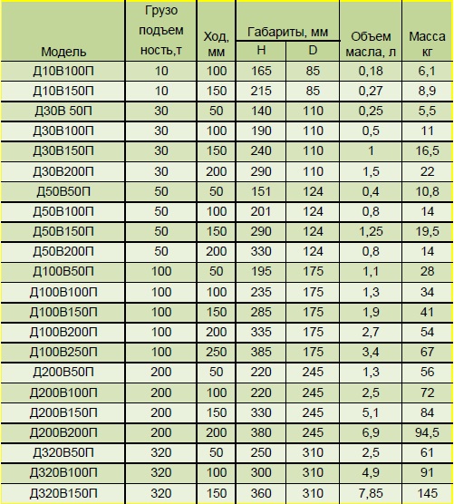 Гидравлические домкраты моделей от Д10В100П до Д320В150П - базовые модели домкратов. Простые,состоящие из трех базовых деталей. -компенсация внецентренных нагрузок, -работа в любой плоскости,пружинный возврат поршня -наименьшая строительная высота при требуемом ходе поршня -все нагруженные детали из высокопрочных марок сталей, термообработанные, шлифованные, с покрытиями -встроенный клапан безопасности надежно удерживает груз на весу при порыве рукава.