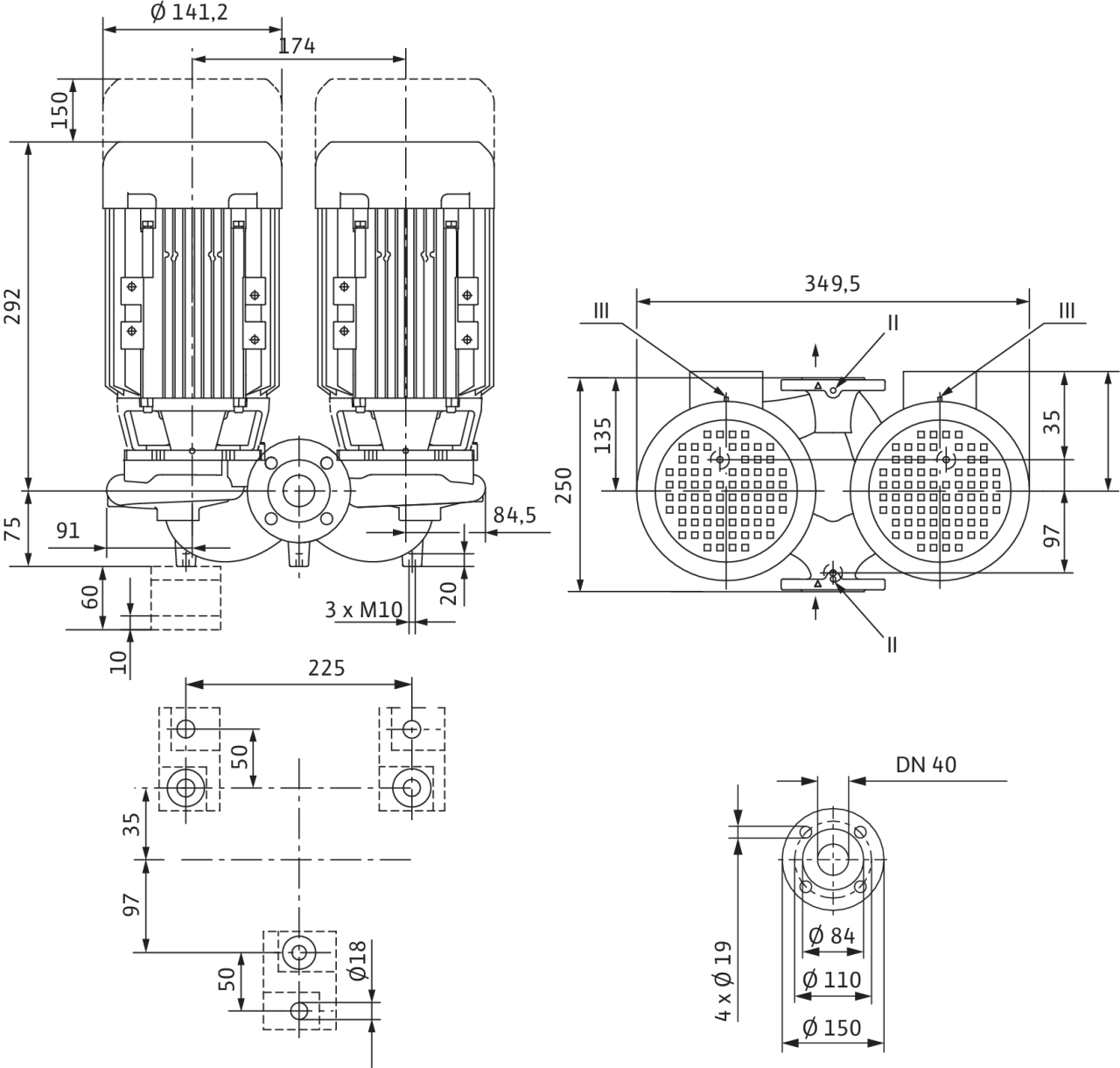 Корпус с опорными ножками для монтажа на фундаменте, консоли по запросу; II отверстие для измерения давления R1/8; III удаление воздуха R1/8