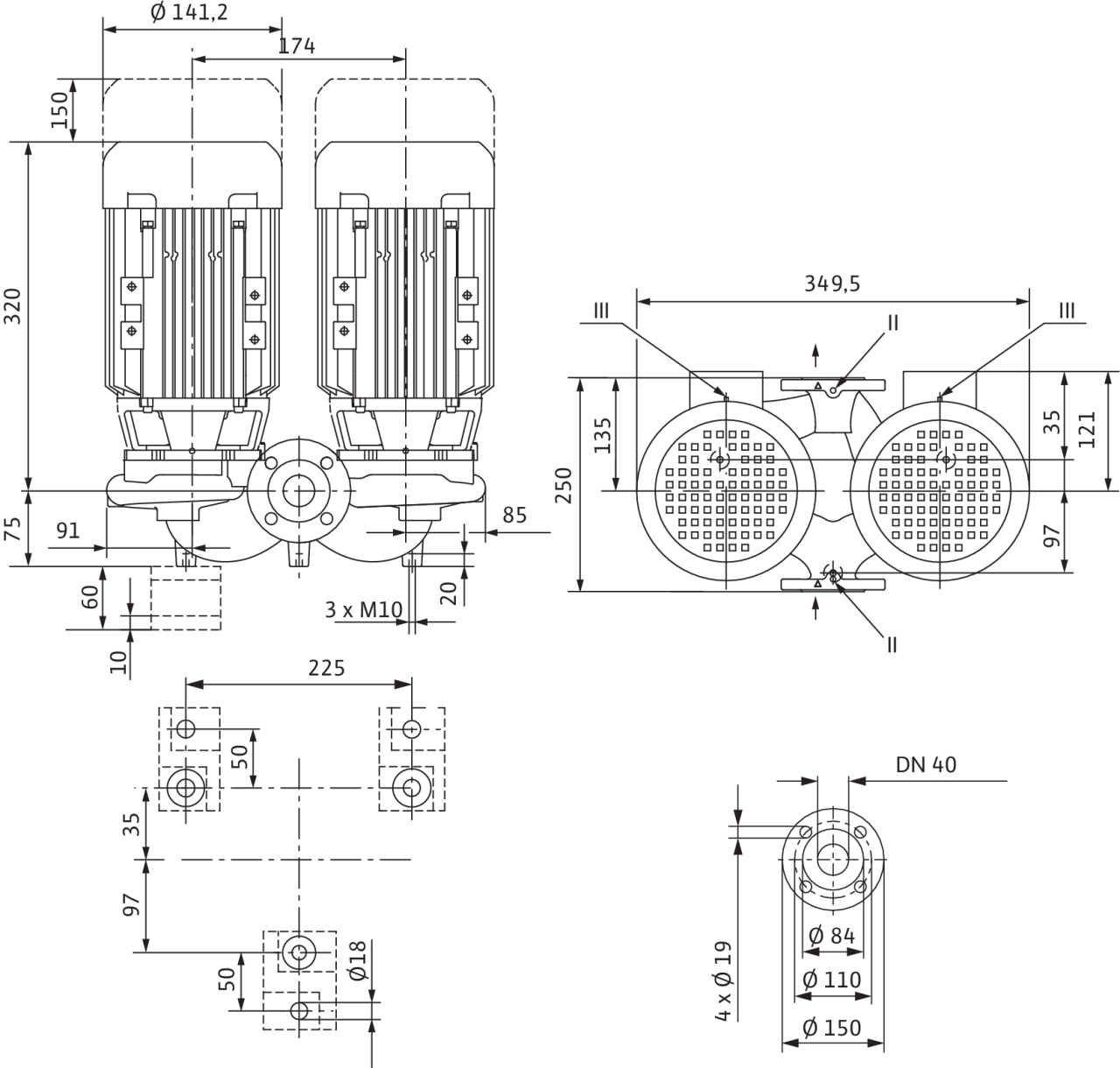 Корпус с опорными ножками для монтажа на фундаменте, консоли по запросу; II отверстие для измерения давления R1/8; III удаление воздуха R1/8