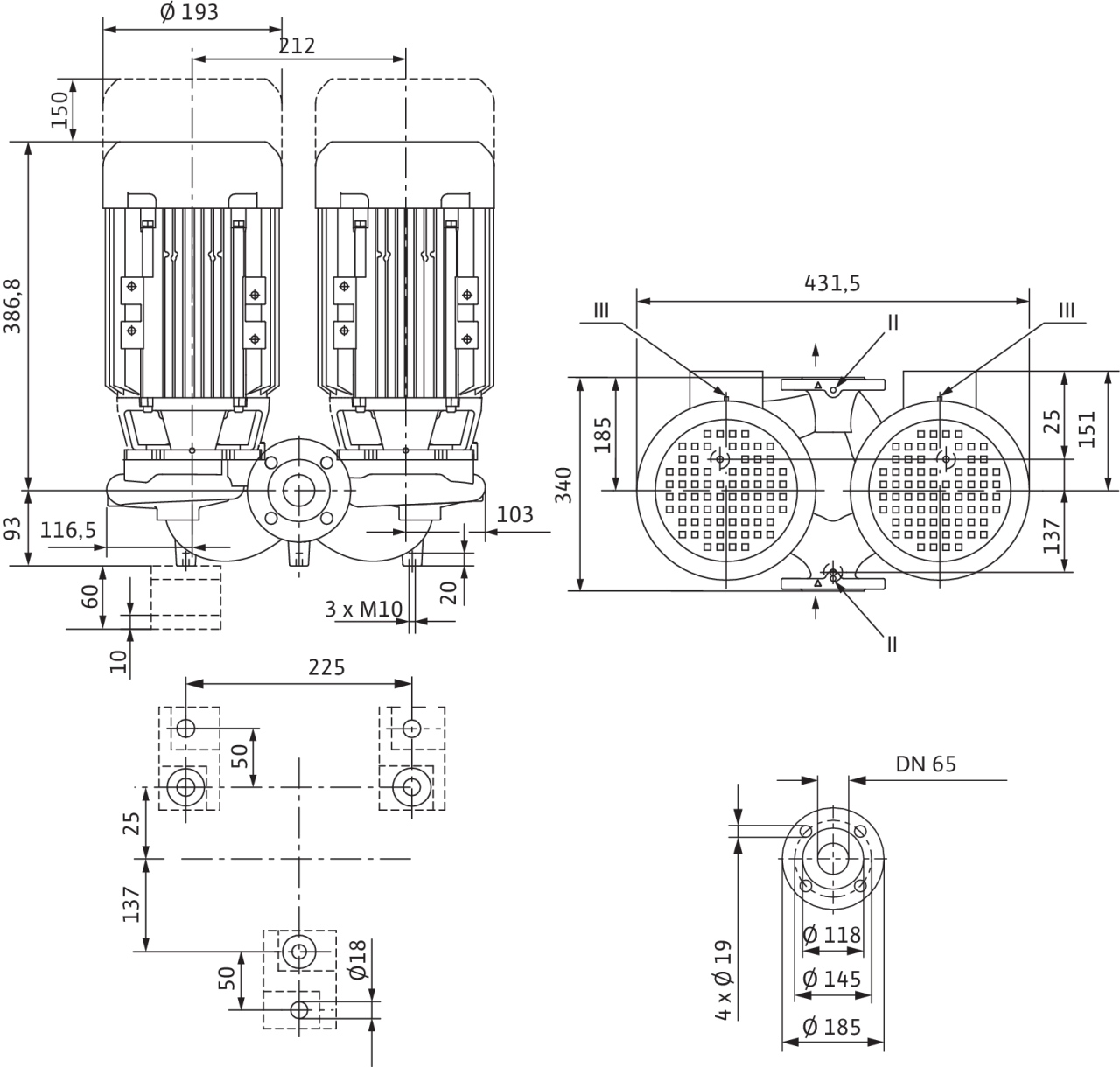 Корпус с опорными ножками для монтажа на фундаменте, консоли по запросу; II отверстие для измерения давления R1/8; III удаление воздуха R1/8