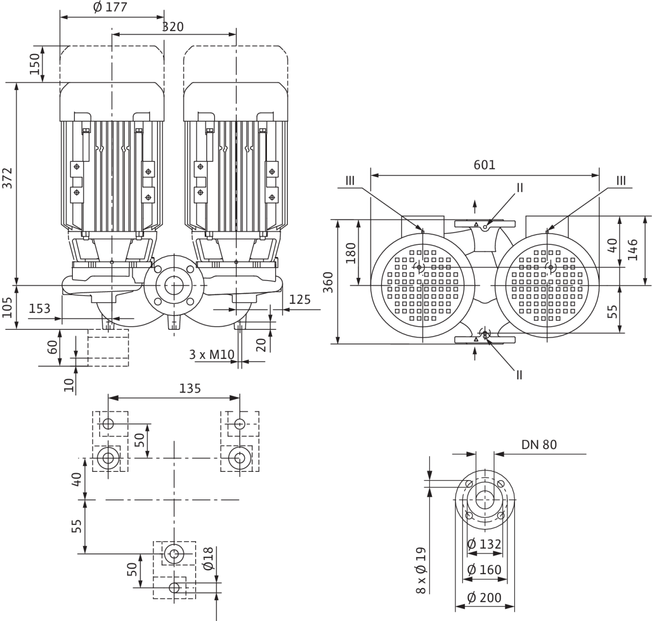 Корпус с опорными ножками для монтажа на фундаменте, консоли по запросу; II отверстие для измерения давления R1/8; III удаление воздуха R1/8