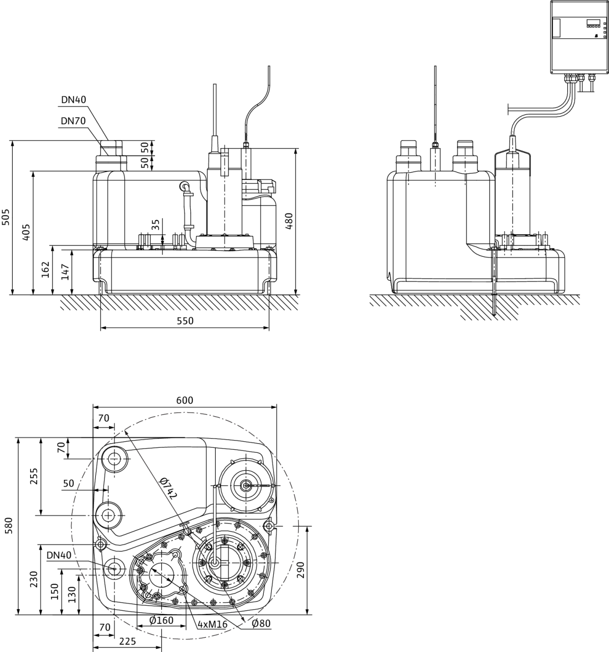 Готовая к подсоединению, полностью затапливаемая автоматическая напорная установка для отвода сточных вод в виде однонасосной установки. Электродвигатель насоса с сухим ротором в однофазном исполнении с корпусом из нержавеющей стали и датчиком контроля температуры обмотки электродвигателя. Газо- и водонепроницаемый сборный резервуар из пластмассы с наклонным дном для предотвращения образования отложений и гарантии надежной эксплуатации, подводящими патрубками на выбор и системой контроля уровня с поплавковым выключателем. Прибор управления с микропроцессорным управлением с