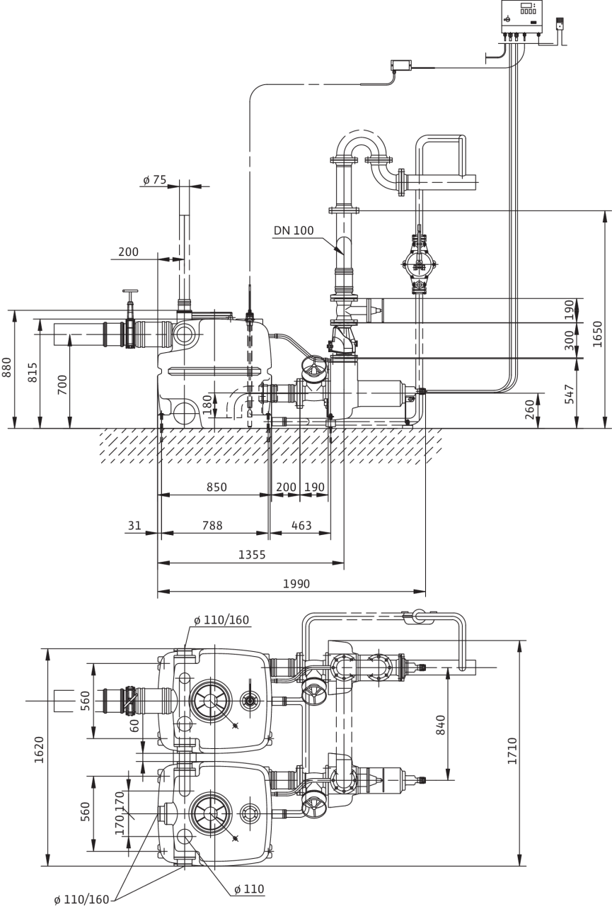 Готовая к подсоединению, полностью затапливаемая автоматическая напорная установка для отвода сточных вод в виде двухнасосной установки с автоматическим переходом с резервного режима на режим пиковой нагрузки. Два отдельно предвключенных непогруженных погружных насоса для отвода сточных вод в трехфазном исполнении с охлаждающим кожухом, корпусом из нержавеющей стали и датчиком контроля температуры обмотки электродвигателя. Два газо- и водонепроницаемых сборных резервуара из пластмассы с четко определенными подключениями к подводящему трубопроводу и системой регулирования уровня при помощи датчика уровня. Прибор управления с микропроцессорным управлением с