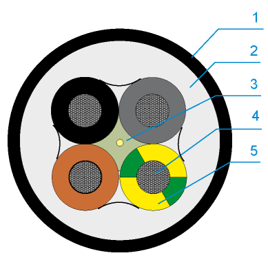 | Число жил x ном. поперечное сечение мм2 | Диаметр проводника, ок. мм | Сопротивление, макс. при 20°C Ом/км | Толщина стенки изолир. оболочки, ном. вел. мм | Диаметр жил, ок. мм | Толщина стенки внутр. оболочки, ном. вел. мм | Толщина стенки внешней оболочки, ном. вел. мм | Внешний диаметр, мин./макс. мм | Вес кабеля, ок. кг/км |