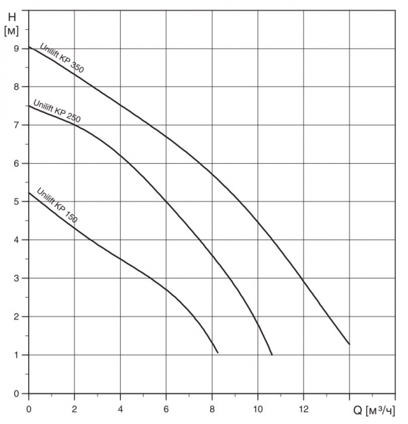 Насосы Unilift KP являются погружными дренажными насосами, подходящими как для стационарной, так и для переносной установки. Они могут использоваться для перекачивания дренажной воды и серых стоков. Они также подходят для установки в сборных резервуарах. Unilift KP это одноступенчатые дренажные насосы с полуоткрытым рабочим колесом, спроектированные для перекачивания дренажной воды и серых стоков. Все насосы Unilift KP могут поставляться с реле контроля уровня или без него. Варианты исполнения обозначаются буквами A, AV или M, что означает автоматический или ручной режим работы. Вариант исполнения Unilift KP-AV для узких колодцев поставляется с обратным клапаном с вращающимся диском для установки на выходном отверстии. Сетчатый фильтр крепится к корпусу насоса хомутом. Unilift KP — одноступенчатые, погружные, дренажные насосы с прочной конструкцией из нержавеющей стали с направленным вверх напорным патрубком, установленным в верхней части насоса. Наружный корпус имеет цельное исполнение. Силовой кабель и кабель реле контроля уровня подключены к одному вулканизированному герметичному штепселю, который вставлен в разъём на загерметизированном корпусе статора. Двигатель является однофазным или трёхфазным, синхронным, герметизированным с наполненной жидкостью камерой ротора и подшипниками с водяной смазкой. Двигатель охлаждается перекачиваемой жидкостью, которая его обтекает. Класс защиты: IP 68 Класс изоляции: F Двигатель оснащен автоматической защитой от перегрузки. После охлаждения до нормальной температуры, двигатель автоматически включается снова.