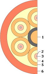 Конструкция: 1. Центральный силовой элемент (ЦСЭ) — стеклопластиковый диэлектрический стержень. 2. Оптическое волокно. 3. Плотное буферное покрытие (tight buffer) 900 мкм. 4. Упрочняющие арамидные нити. 5. Оболочка из полимерного материала. 6. Оболочка из полимерного материала, не распространяющего горение или из безгалогенного материала с низким дымовыделением. * — В качестве оптических модулей используются кабели типа БСШ. Цвет оболочки соответствует следующей системе кодировки (если иное специально не оговорено в заказе): |