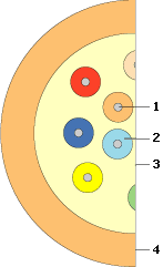 Конструкция: 1. Оптическое волокно*. 2. Плотное буферное покрытие (tight buffer) 900 мкм. 3. Упрочняющие арамидные нити. 4. Оболочка из полимерного материала, не распространяющего горение или из безгалогенного материала с низким дымовыделением. * — Количество волокон данном кабеле — 2, 4, 6, 8, 12. (для количества волокон более 12, кабель имеет марку БПСР) Цвет оболочки кабеля соответствует следующей системе кодировки (если иное специально не оговорено в заказе): |