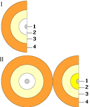 Конструкция: 1. Оптическое волокно. 2. Плотное буферное покрытие (tight buffer) 900 мкм. 3. Упрочняющие арамидные нити. 4. Оболочка из полимерного материала, не распространяющего горение или из безгалогенного материала с низким дымовыделением. Кабель ЭКБ-БДШ (II) изготавливается в виде ленточной (плоской) конструкции из двух кабелей типа БСШ, оболочки которых соединены вдоль друг друга. Цвет оболочки кабеля соответствует следующей системе кодировки (если иное специально не оговорено в заказе): |
