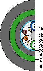 Конструкция: 1. Центральный силовой элемент (ЦСЭ) — стальная проволока. 2. Оптический модуль со свободно уложенными волокнами в оболочке из ПБТ и заполненный гидрофобным заполнителем. 3. Межмодульный гидрофобный заполнитель. 4. Витая пара. 5. Скрепляющая нить. 6. Промежуточная оболочка из полимерного материала. 7. Броня из стальной гофрированной ленты. 8. Защитный шланг из полимерного материала. |
