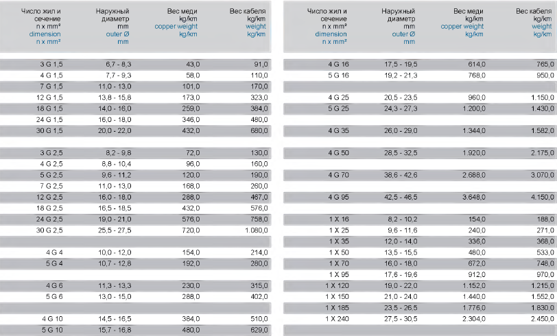 | Артикул | Название | Информация | Диаметр | Размеры | Вес меди | Вес кабеля |