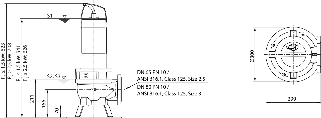 Полностью погружной дренажный насос для отвода сточных вод для стационарной и мобильной установки в погруженном состоянии, для перекачивания загрязненной воды и сточных вод с фекалиями (область применения согласно EN 12050). Гидравлический корпус и рабочее колесо из серого чугуна, корпус электродвигателя из нержавеющей стали. Электродвигатель насоса с сухим ротором в исполнении для трехфазного тока с камерой уплотнений и датчиком температуры обмотки электродвигателя. Соединительный кабель длиной 10 м с установленным трехфазным штекером и поплавковым выключателем для автоматического регулирования уровня. Уплотнение со стороны перекачиваемой жидкости и со стороны электродвигателей осуществляется двумя скользящими торцевыми уплотнениями независимо от направления вращения.