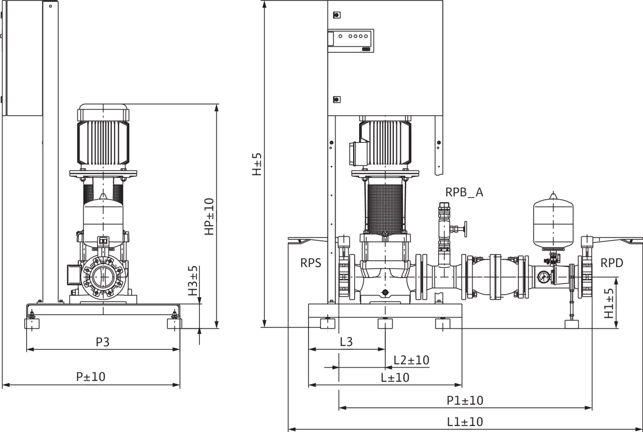 DN 100Номинальные внутренние диаметры трубы на стороне всасывания RPS
