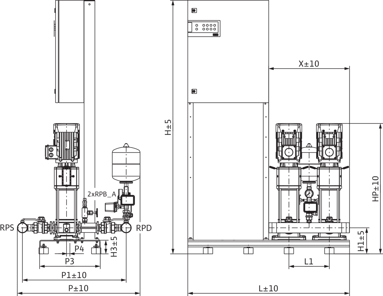 Мембранный напорный бак (объем 8 л), система накопительных трубопроводов с всасывающей и напорной стороны для каждого насоса: обратный клапан, запорные арматуры с всасывающей и напорной стороны (в открытом состоянии опломбированы), манометр, манометрический переключатель для автоматического управления установкой.