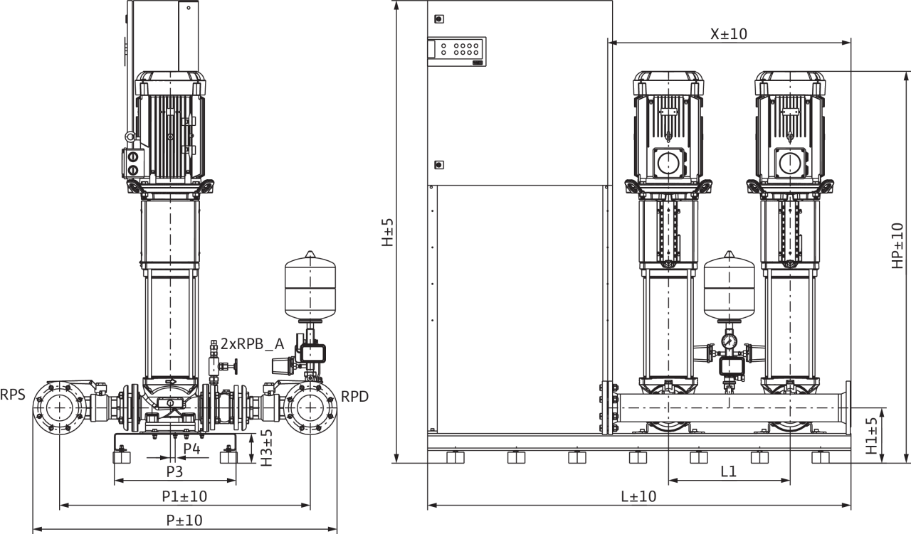 Мембранный напорный бак (объем 8 л), система накопительных трубопроводов с всасывающей и напорной стороны для каждого насоса: обратный клапан, запорные арматуры с всасывающей и напорной стороны (в открытом состоянии опломбированы), манометр, манометрический переключатель для автоматического управления установкой.
