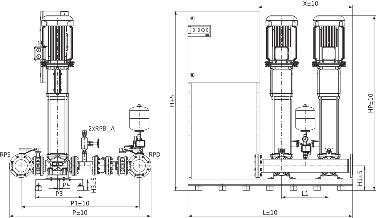 Мембранный напорный бак (объем 8 л), система накопительных трубопроводов с всасывающей и напорной стороны для каждого насоса: обратный клапан, запорные арматуры с всасывающей и напорной стороны (в открытом состоянии опломбированы), манометр, манометрический переключатель для автоматического управления установкой.